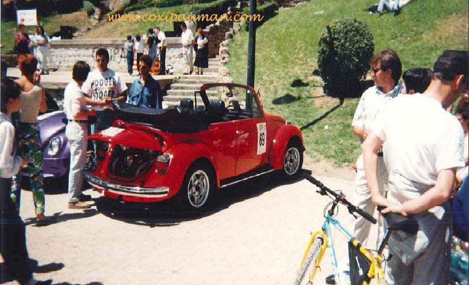 2 cox Espagnoles sur la droite. Cox turquoise de Fred, Cox noire du pin's suivie d'une blanche (je me souviens plus a qui elle apartenais) puis le Buggy de Charles. On voit ici Vincente et Charles et enfin la cox violette de Nicolas.